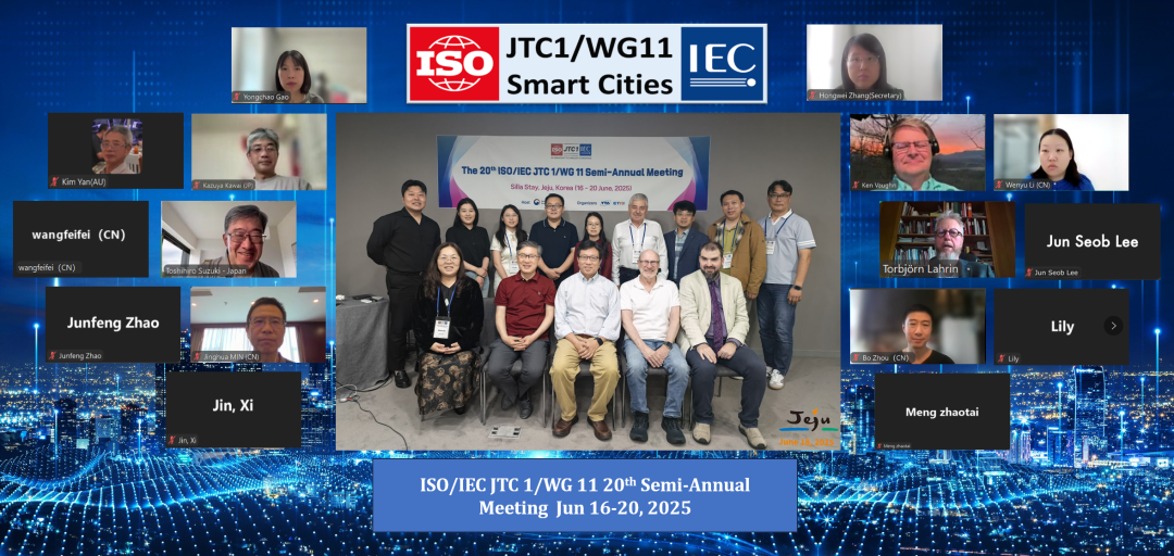 2025年6月16至20日,ISO/IEC JTC 1/WG 11(智慧城市工作组)第二十次全体会议以线上线下结合方式召开,线下会场设于韩国济州。来自中国、加拿大、日本、韩国、澳大利亚等国家成员体,以及JTC 1/AG 14、ISO/IEC JTC 1/SC 27、ISO/TC 304、IEC/SyC Smart Cities、SBS、ISO/TC 204等相关组织的31名专家代表出席了本次会议。会议由JTC 1/WG 11召集人钱恒主持,由JTC 1/WG 11秘书张红卫支撑。