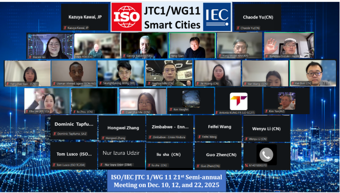 2025年12月10日、12日及22日,ISO/IEC JTC1/WG11(智慧城市工作组)第二十一次全体会议以线上方式召开。来自中国、加拿大、日本、韩国、澳大利亚、马来西亚、尼日利亚、津巴布韦等国家成员体,以及JTC 1/AG 14、JTC 1/SC 27、ISO/TC 204、SBS等相关组织的31名专家代表出席了本次会议。全国数据标准化技术委员会秘书处(中国电子技术标准化研究院)组织中国代表团参会。代表团由来自中国电子技术标准化研究院、齐鲁工业大学、中国人民大学、山东省计算中心、浪潮智慧城市科技有限公司、华为技术有限公司、湖北省标准化与质量研究院、北京清华同衡规划设计研究院、成都市标准化研究院、联通智能城市研究院等单位的专家组成。