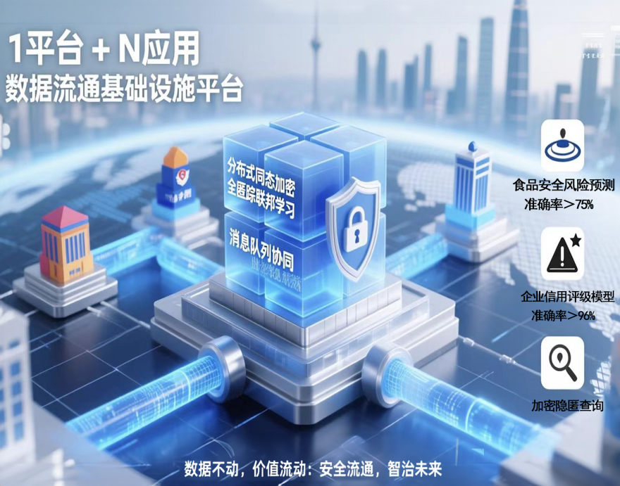 深圳政务数据智慧互联示范项目创新构建“数据可用不可见、治理协同不越界”的安全流通模式,破解跨部门数据协同与安全合规难题。项目以隐私计算为核心,融合加密通信与分布式存储技术,构建安全可控的数据流通基础设施,提供标准化协作通道,有效化解政务数据孤岛与安全流通之间的矛盾。示范项目聚焦关键技术攻坚:优化分布式同态加密、创新设计全匿踪联邦训练以及融合消息队列等技术,实现数据“零泄漏”高效分析,并打造“1平台+N应用”体系,应用成效显著:食品经营主体营业状态识别模型准确率超75%,推动事后处置转事前预警;企业信用评级模型准确率超96%,助力小微企业融资;加密隐匿查询精准识别虚假注册及虚开发票风险,成功释放多域治理与经济价值。