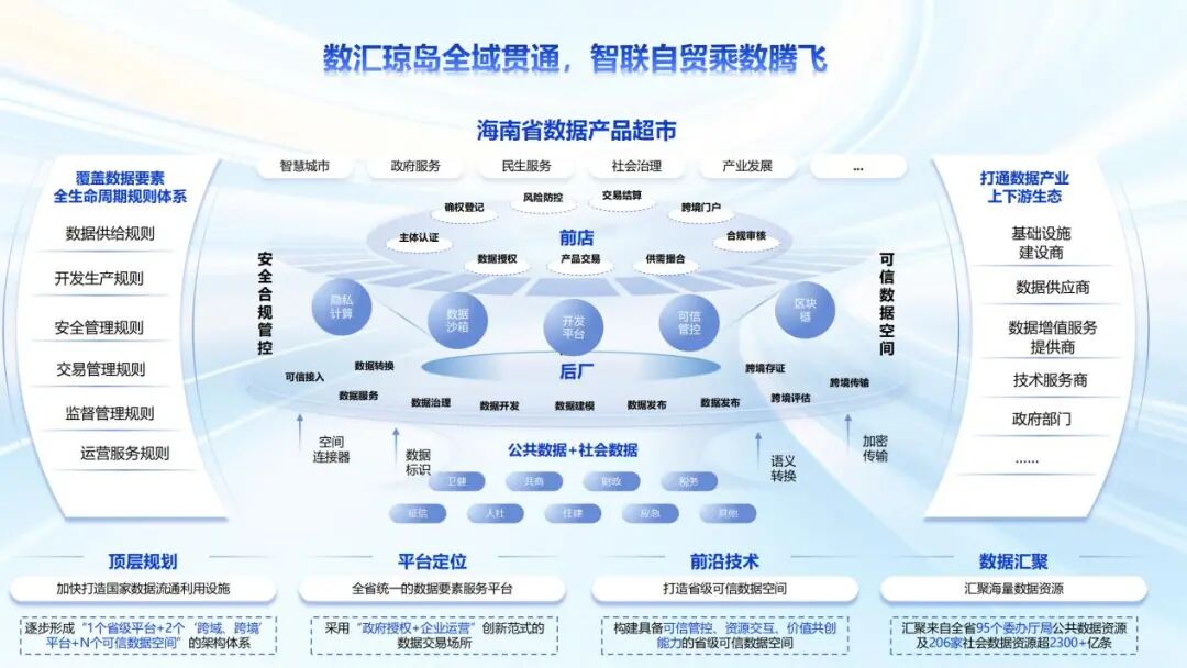 海南创新构建以公共数据为基础的省级城市可信数据空间,以海南省数据产品超市为省级核心枢纽,依托隐私计算、区块链等前沿技术筑牢数字底座,逐步联动市县和行业,形成"全省数据一张网”的全岛一体化数据基础设施。海南以数据基础设施为支撑生态协同为导向,发布涵盖数据要素全生命周期的20余项创新性管理规则,汇聚政务社会、国际多元数据资源共2356亿条数据,形成10万+个数据目录,开发1139个数据原子能力,上架604个逻辑真实数据集。聚焦航天卫星、南繁种业、文旅消费、跨境贸易等特色产业,探索数据融合、全域赋能的应用场景,上架2669个数据产品,携手2100余家合作伙伴构建可信数据空间协同体系。以自贸港的开放优势和先行先试的政策红利,提供自贸港特色的数据要素市场化改革样本。