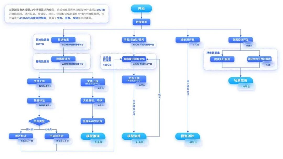 一是打造适配发电领域多元应用场景的高质量数据集,支撑擎源发电大模型训练,助力设备智能诊断等场景应用。以擎源发电大模型75个场景需求为牵引,系统梳理发电行业超过700TB的数据资料,依托集团人工智能数据工程工具链,通过采集、预清洗、标注、评测和优化到交付的全流程管理,从中清洗出450GB的高质量数据集,覆盖了文本、图像、视频等多种类型。