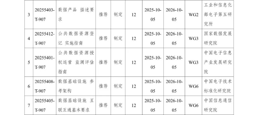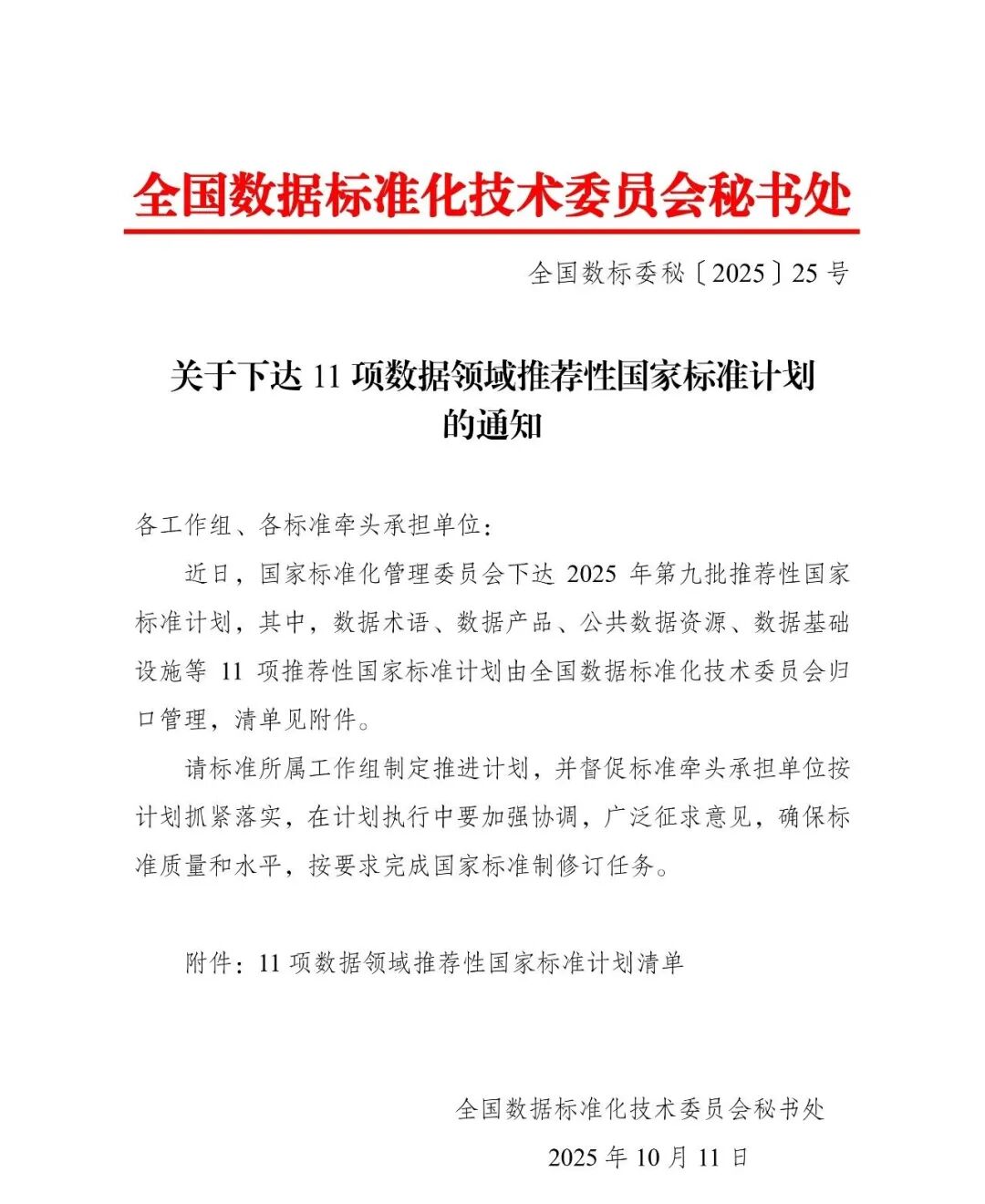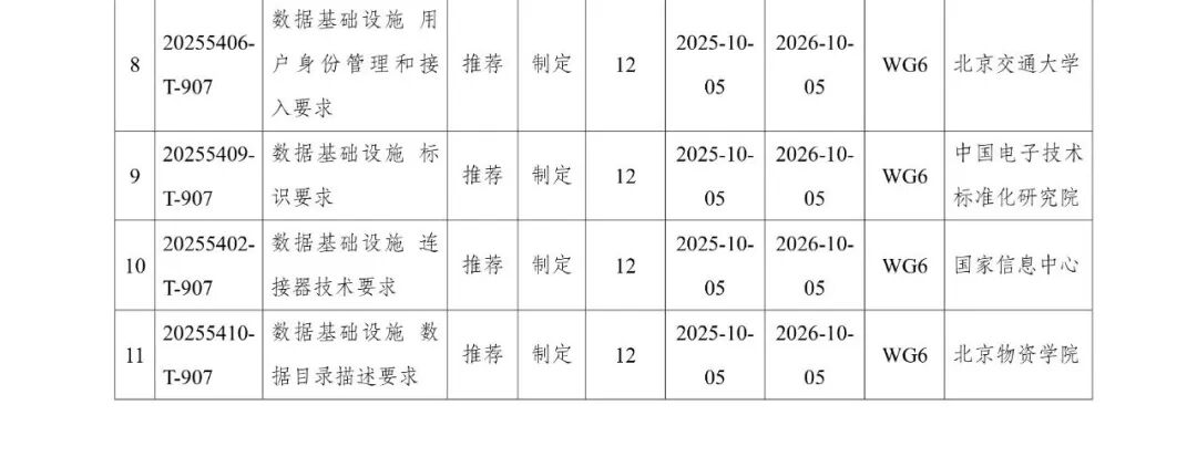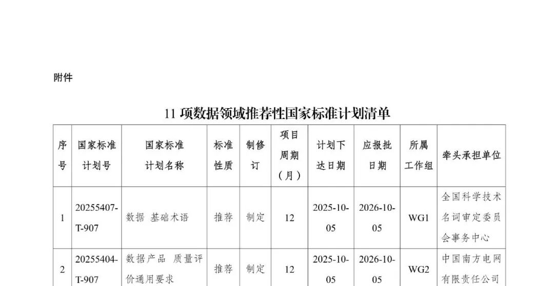 近日,国家标准化管理委员会下达2025年第九批推荐性国家标准计划,其中,数据术语、数据产品、公共数据资源、数据基础设施等11项推荐性国家标准计划由全国数据标准化技术委员会归口管理,清单见附件。