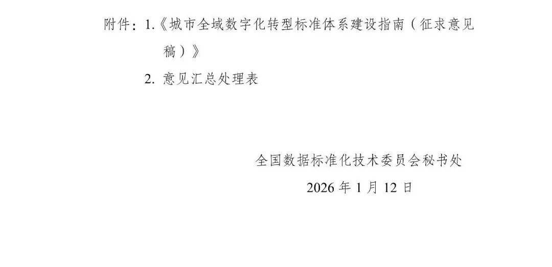 为贯彻落实《关于深化智慧城市发展 推进城市全域数字化转型的指导意见》《深化智慧城市发展推进全域数字化转型行动计划》等政策文件要求,充分发挥标准在促进城市数字化转型规范化、高质量发展等方面的基础性、引领性作用,在国家数据局指导下,全国数据标准化技术委员会秘书处联合全域数字化转型标准工作组组织编制了《城市全域数字化转型标准体系建设指南》(以下简称《指南》)(见附件1),经研究讨论、修改完善,形成征求意见稿。