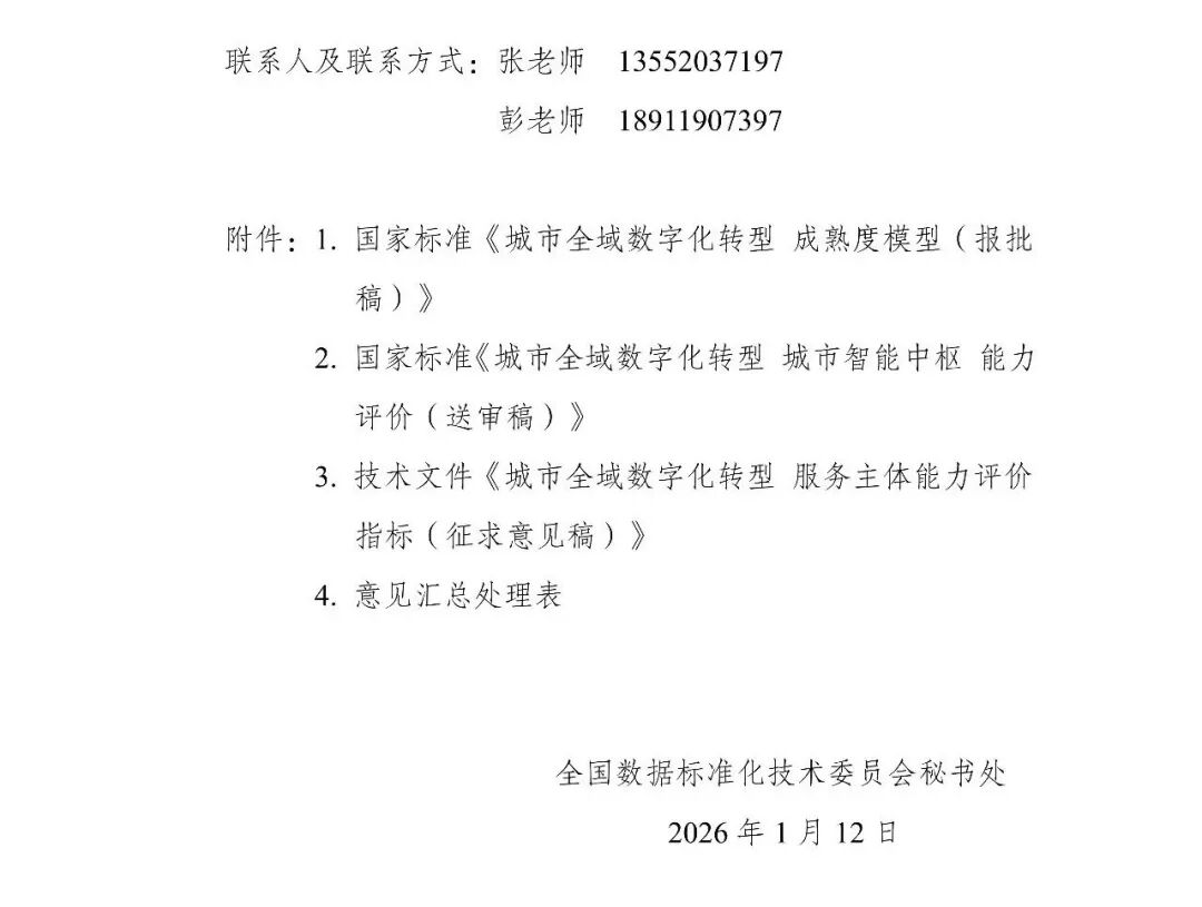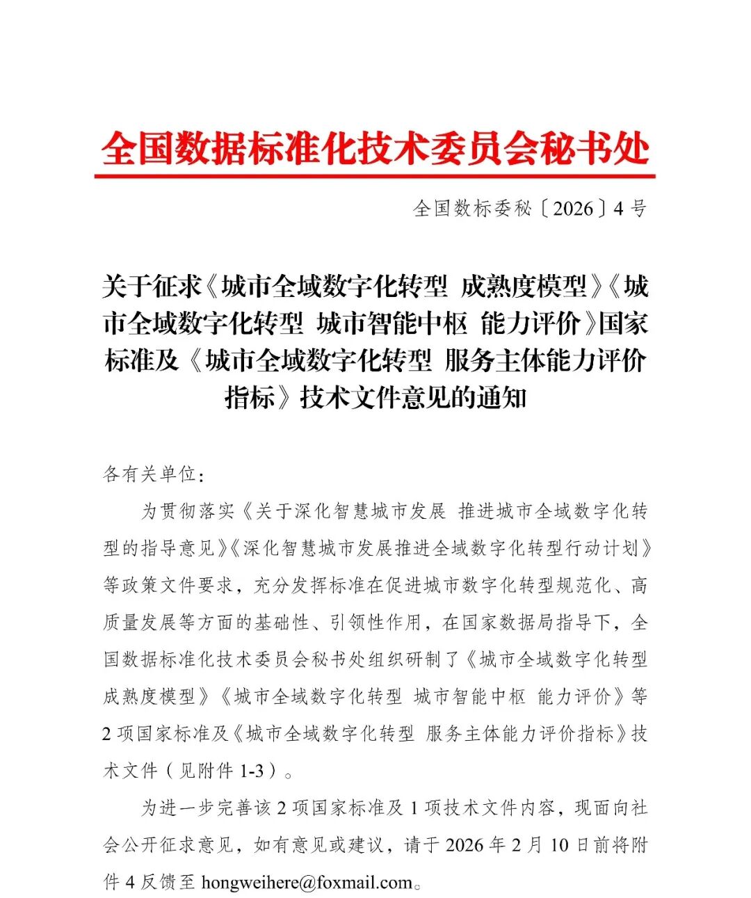 为贯彻落实《关于深化智慧城市发展 推进城市全域数字化转型的指导意见》《深化智慧城市发展推进全域数字化转型行动计划》等政策文件要求,充分发挥标准在促进城市数字化转型规范化、高质量发展等方面的基础性、引领性作用,在国家数据局指导下,全国数据标准化技术委员会秘书处组织研制了《城市全域数字化转型 成熟度模型》《城市全域数字化转型 城市智能中枢 能力评价》等2项国家标准及《城市全域数字化转型 服务主体能力评价指标》技术文件(见附件1-3)。