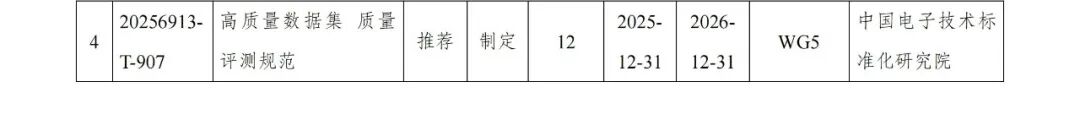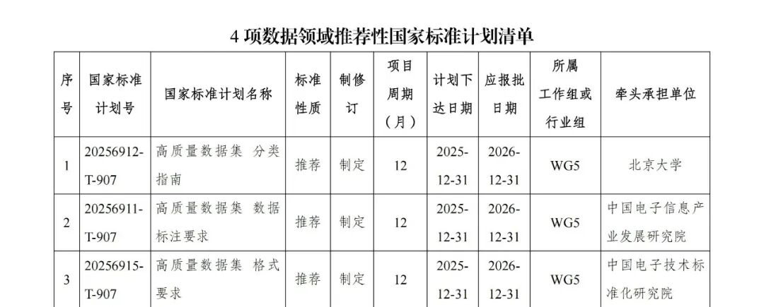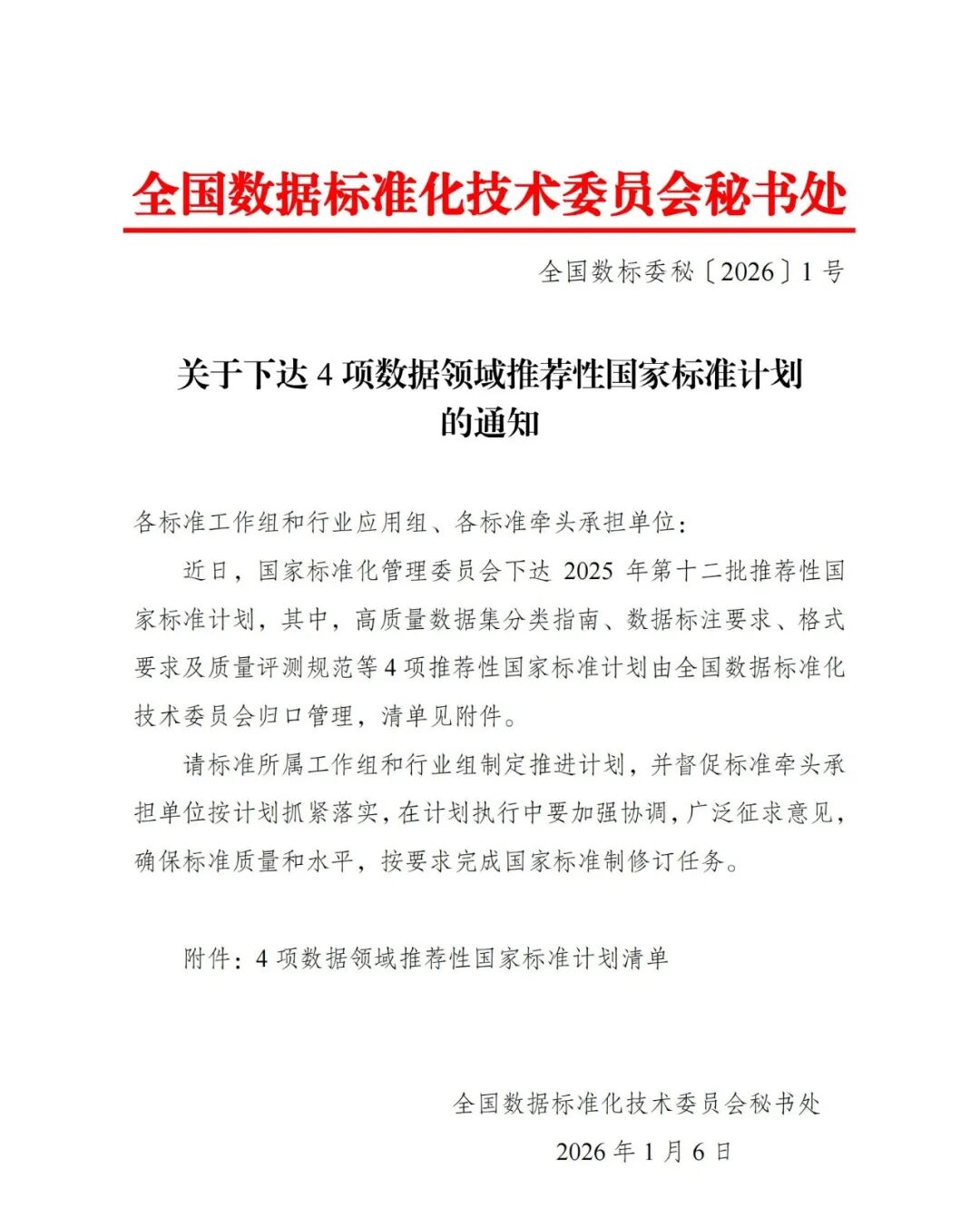 近日,国家标准化管理委员会下达2025年第十二批推荐性国家标准计划,其中,高质量数据集分类指南、数据标注要求、格式要求及质量评测规范等4项推荐性国家标准计划由全国数据标准化技术委员会归口管理,清单见附件。