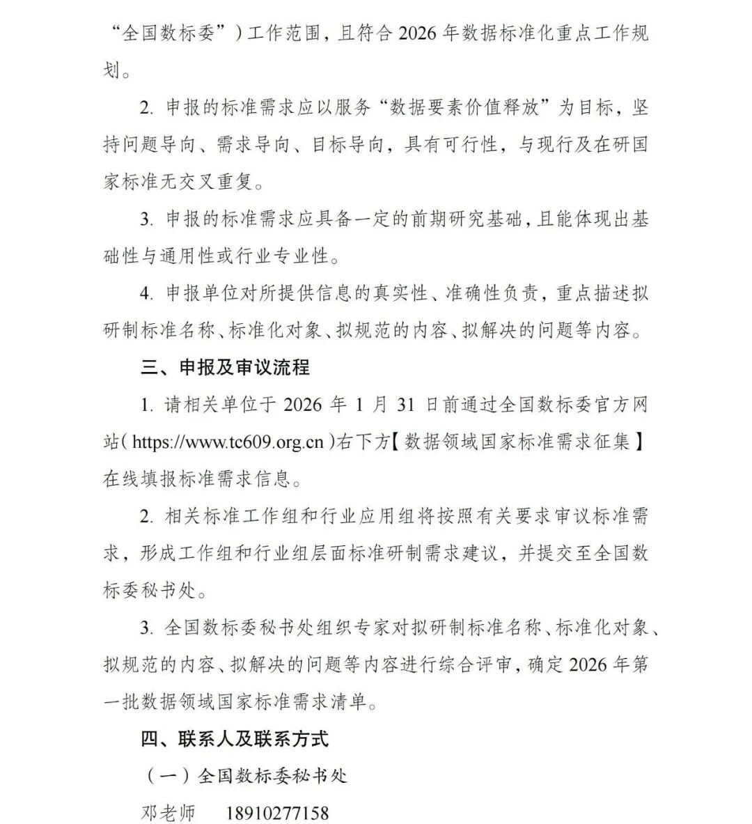 1. 请相关单位于2026年1月31日前通过全国数标委官方网站(https://www.tc609.org.cn)右下方【数据领域国家标准需求征集】在线填报标准需求信息。