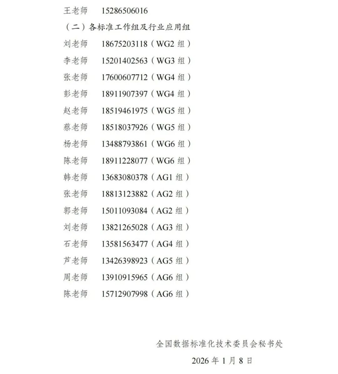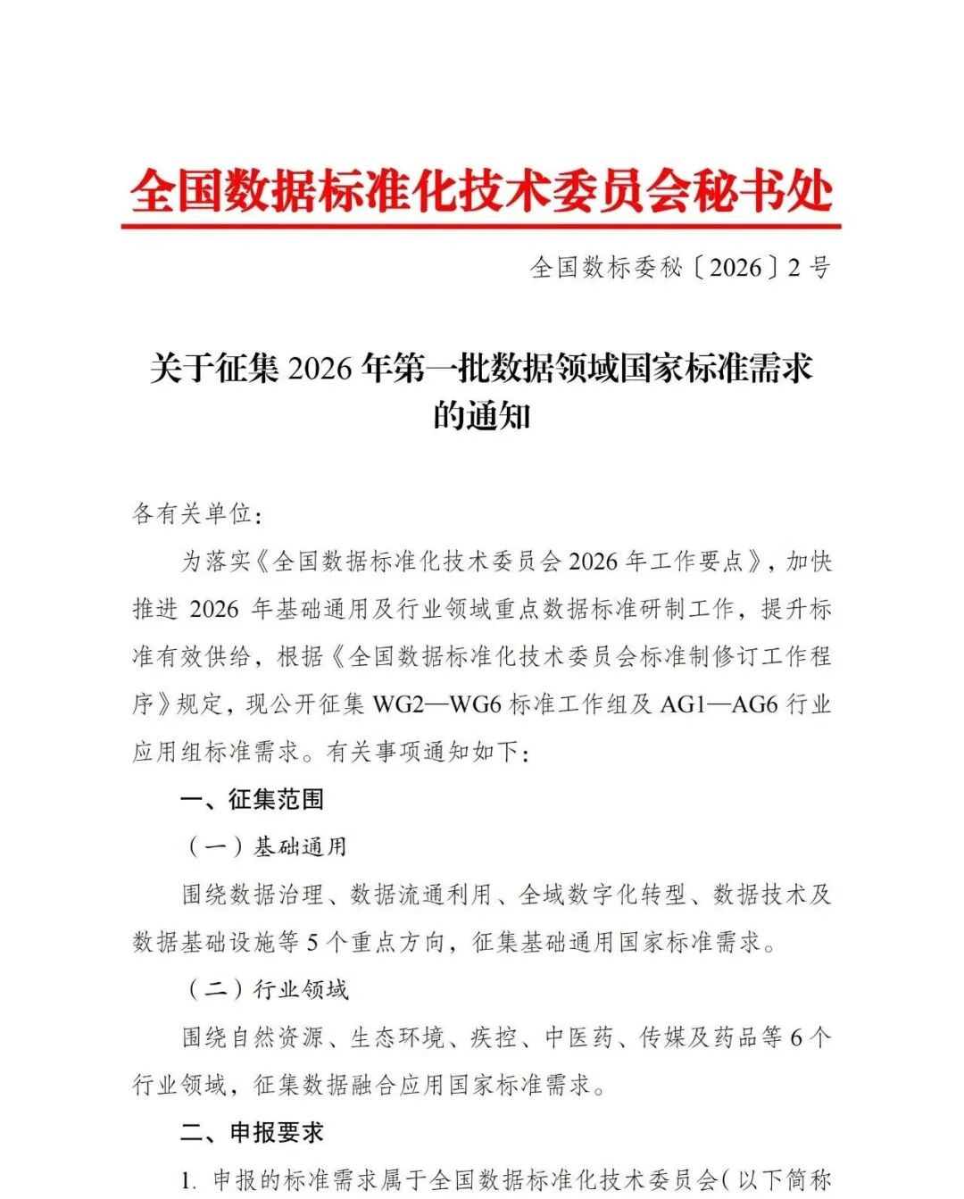 为落实《全国数据标准化技术委员会2026年工作要点》,加快推进2026年基础通用及行业领域重点数据标准研制工作,提升标准有效供给,根据《全国数据标准化技术委员会标准制修订工作程序》规定,现公开征集WG2—WG6标准工作组及AG1—AG6行业应用组标准需求。有关事项通知如下:
